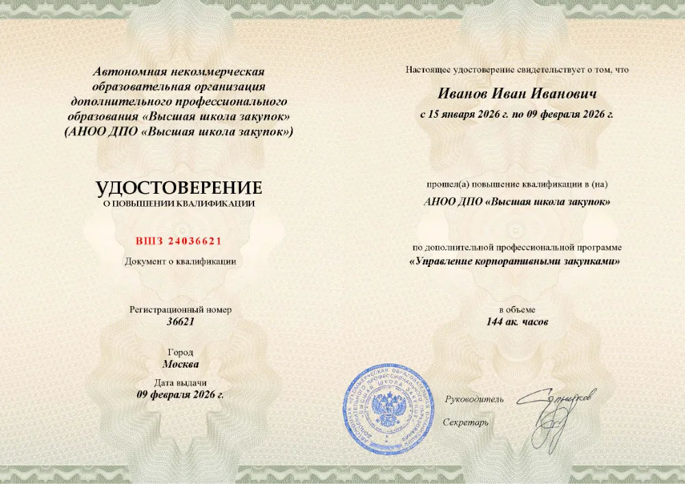 Повышение квалификации для участников закупок (по ст. 38 44-ФЗ) – не менее 40 академических часов (обычно 5–7 дней).
