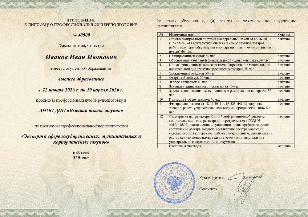 Повышение квалификации для участников закупок (по ст. 38 44-ФЗ) – не менее 40 академических часов (обычно 5–7 дней).