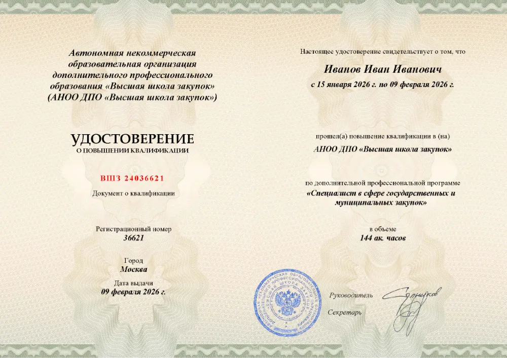 Повышение квалификации для участников закупок (по ст. 38 44-ФЗ) – не менее 40 академических часов (обычно 5–7 дней).